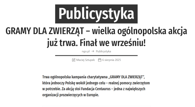 Trwa ogólnopolska kampania charytatywna „GRAMY DLA ZWIERZĄT”, która jednoczy Polskę wokół jednego celu – realnej pomocy zwierzętom w potrzebie. Za akcją stoi Fundacja Centaurus – jedna z największych organizacji prozwierzęcych w Europie.