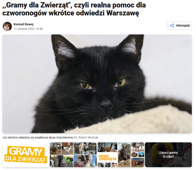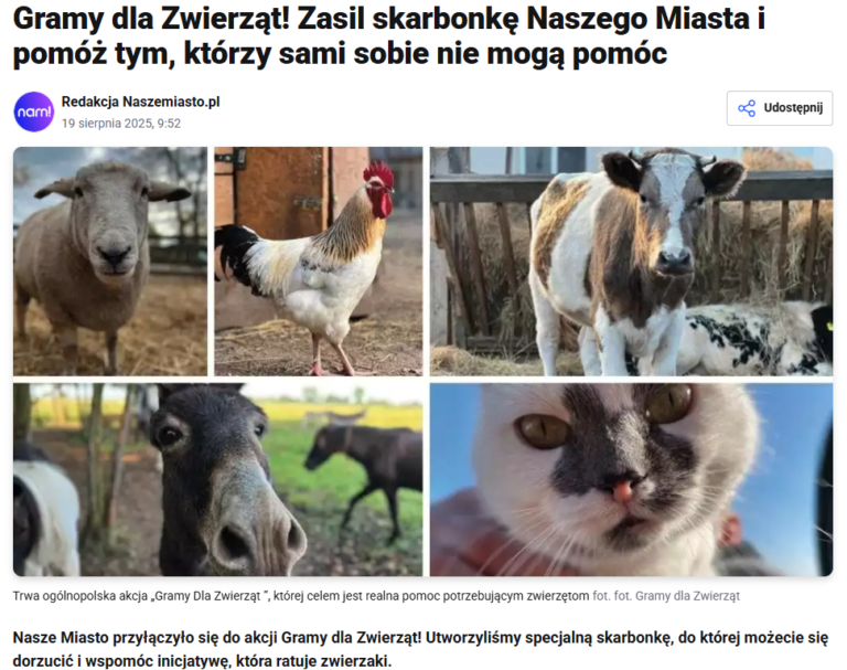 Nasze Miasto przyłączyło się do akcji Gramy dla Zwierząt! Utworzyliśmy specjalną skarbonkę, do której możecie się dorzucić i wspomóc inicjatywę, która ratuje zwierzaki.